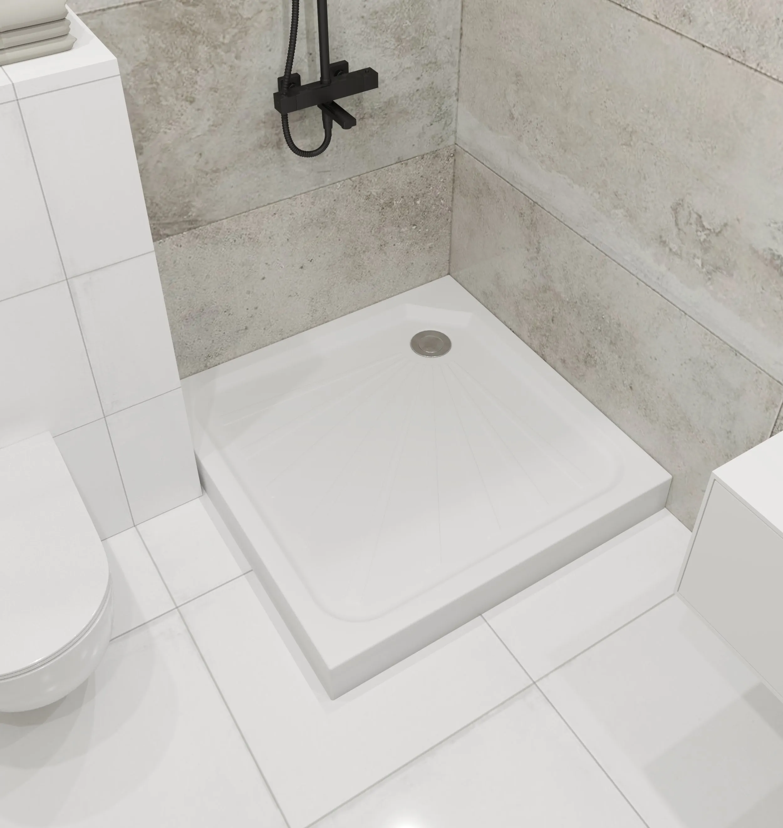 Акриловый душевой поддон – прекрасное решение для небольших ванных комнат. Квадратная форма универсальна для создания стильного гармоничного интерьера. Небольшой уклон в сторону слива и закругленные грани поддона позволяют эффективно стекать воде и предотвращать ее переливание через борт.