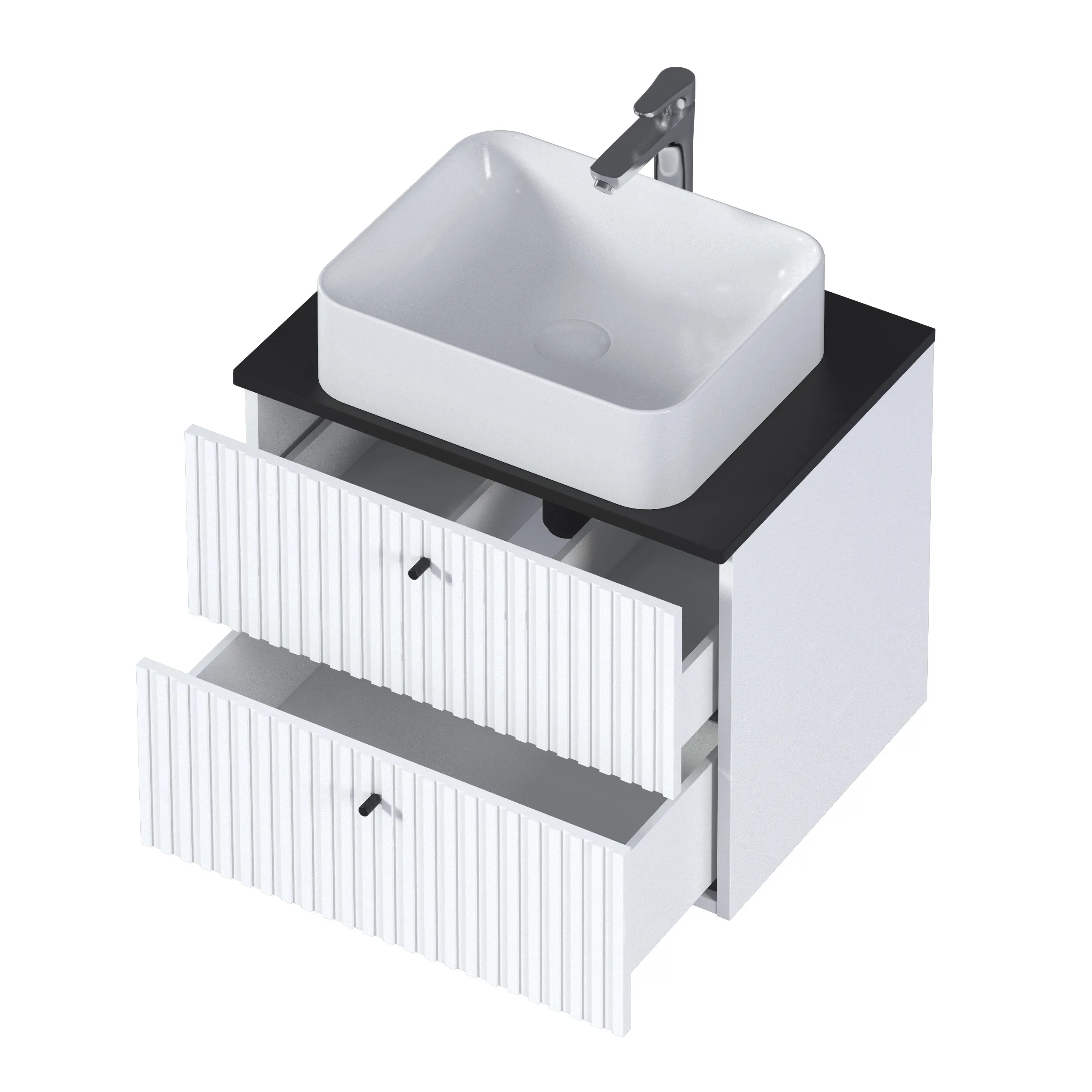 Тумба Desire – изящное решение для интерьера ванной комнаты. Рельефный фасад создает ритмичную игру света и теней. Черные ручки-кнопки контрастируют с белым фасадом и подчеркивают её современный дизайн.