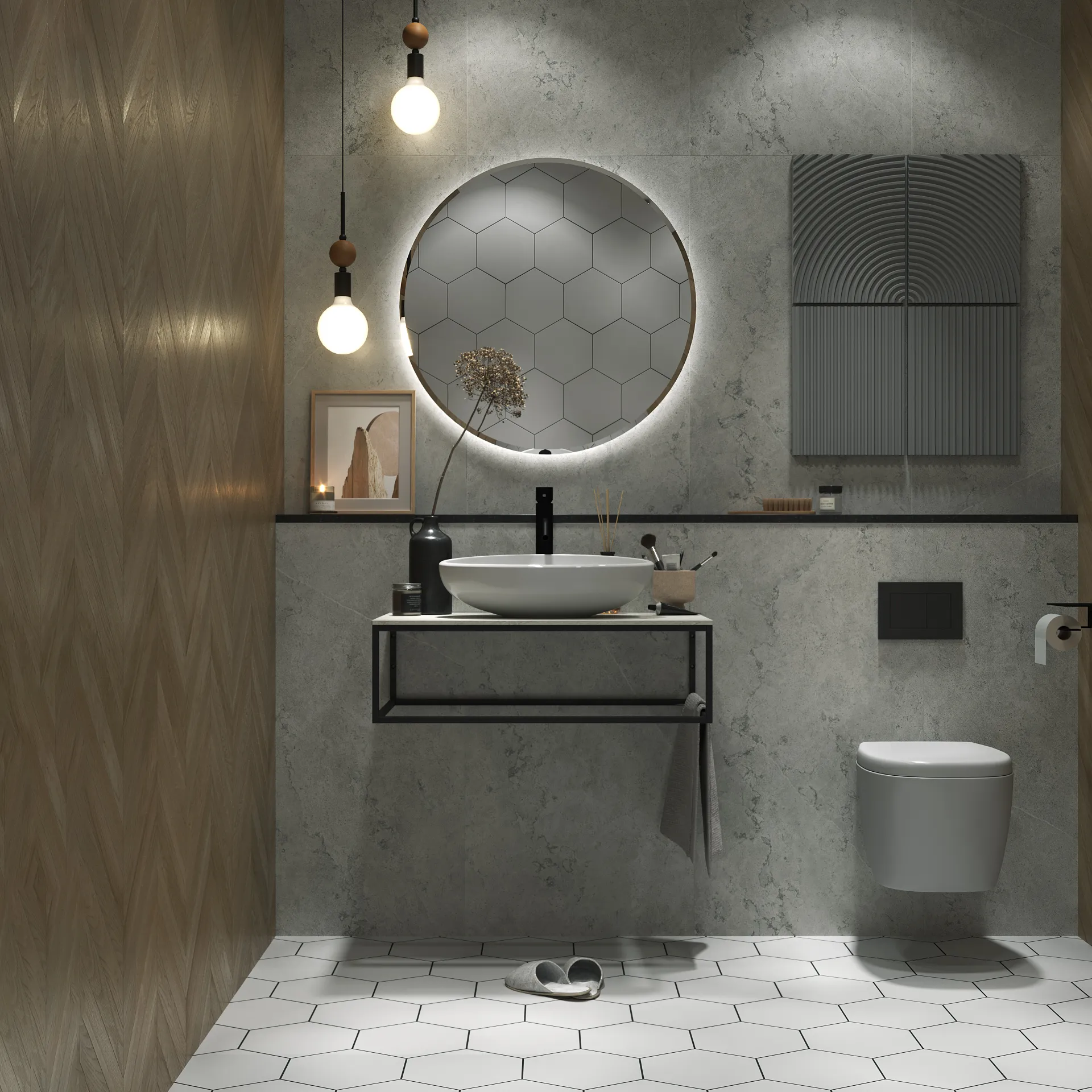 Столешница из керамогранита - это стильное, функциональное и долговечное решение, которое подойдет для ванных комнат, исполненных в самых разнообразных отделочных материалах. Такая универсальность, тем не менее, предполагает высокую декоративную и эстетическую ценность столешницы - она делает обстановку в ванной комнате по-настоящему стильной и соответствующей актуальным тенденциям в дизайне. Металлическое подстолье создает эффектный цветовой контраст, а также может использоваться в качестве практичных рейлингов для удобного размещения полотенец и банных халатов.