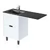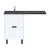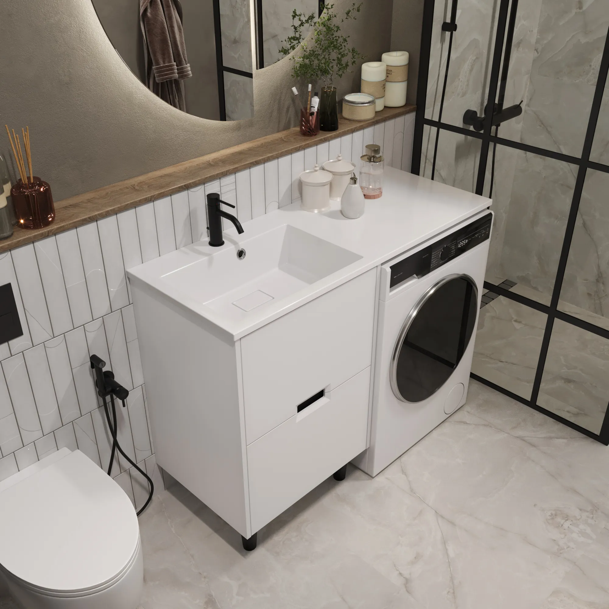 умба под раковину* Maid – элегантное решение "2-в-1", которое объединяет функциональность и стиль, позволяя гармонично разместить раковину и стиральную машину в ванной комнате. Белый цвет легко сочетается с другими цветами и стилями интерьера, предоставляя свободу в оформлении ванной комнаты. Акцентные опоры  черного цвета гармонично дополнят ваш выбор: строгая графитовая или нежная белая раковина – для создания неповторимого стиля ванной комнаты.