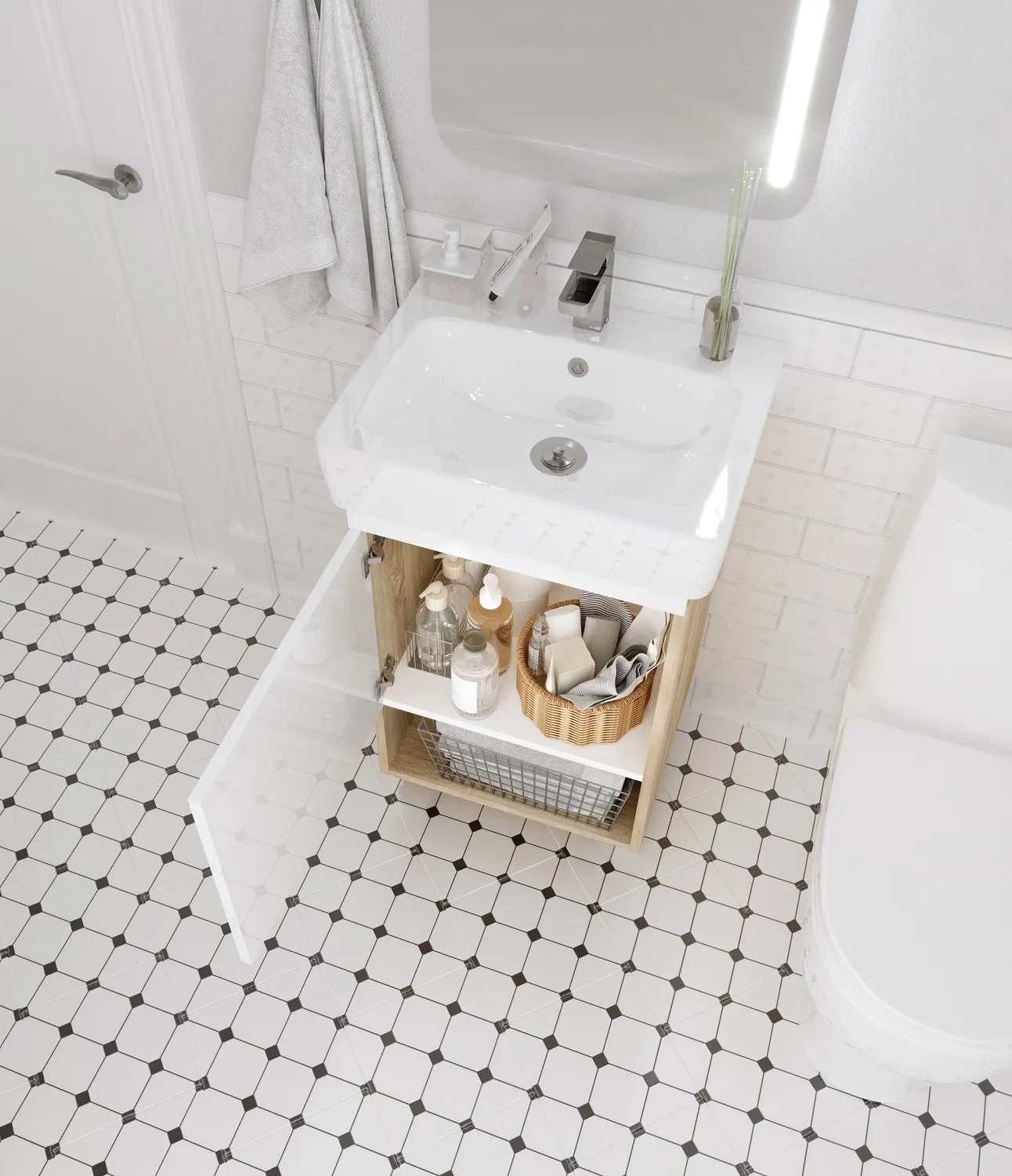 Практичная тумба с многофункциональной конструкцией. Практичная ручка закрывающегося шкафчика может использоваться как держатель для небольших полотенец. Лаконичная конструкция и минималистичный дизайн без лишних деталей делают эту тумбу подходящей для интерьера ванной комнаты в любой стилистике. Она будет одинаково уместна как в классических сдержанных пространствах, так и в современных или даже эклектичных комнатах, оформленных на стыке разных стилей.
