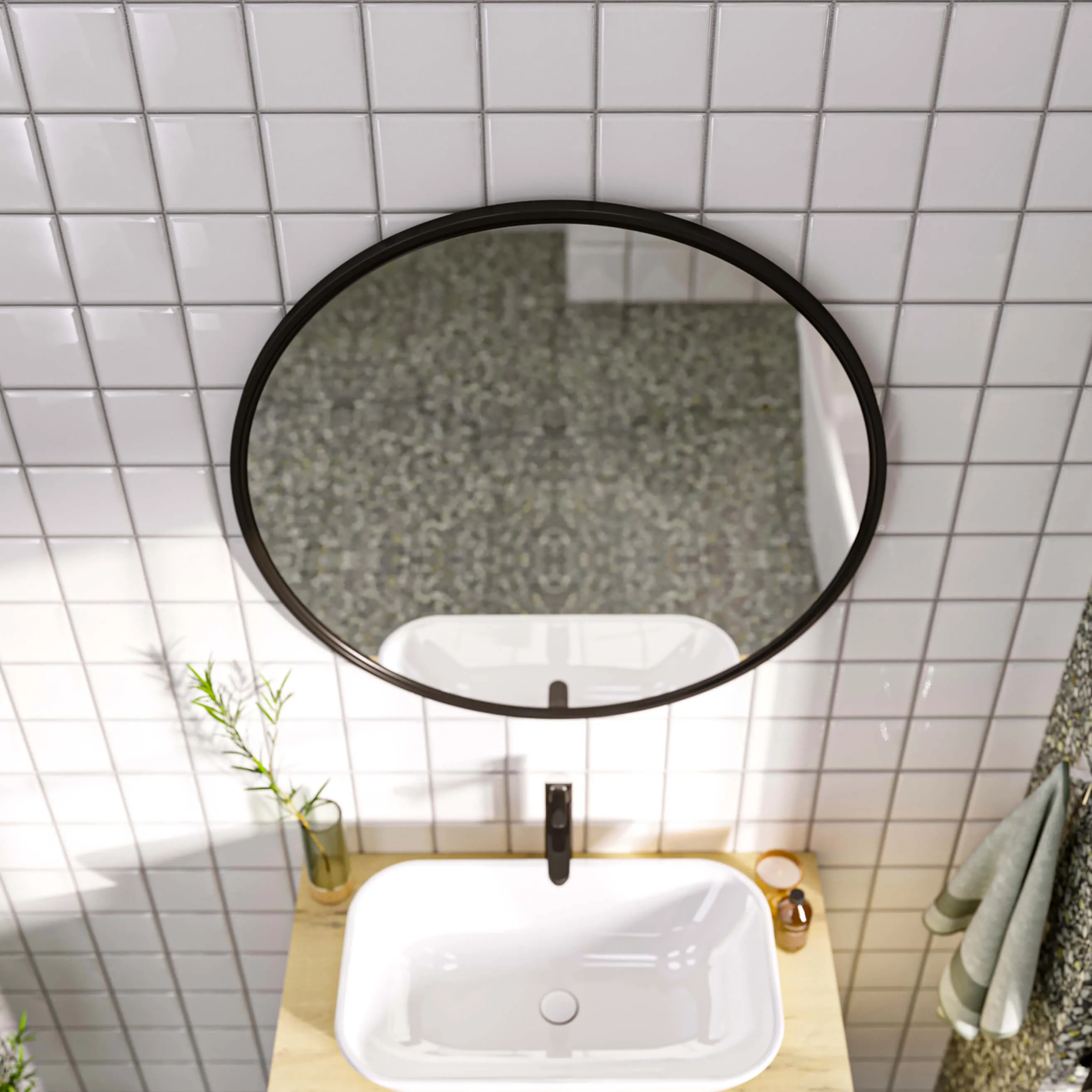 Круглое зеркало с черной рамой Mystery —  стильный функциональный элемент для интерьера ванной комнаты, которое сделает ежедневные процедуры более приятными и комфортными.